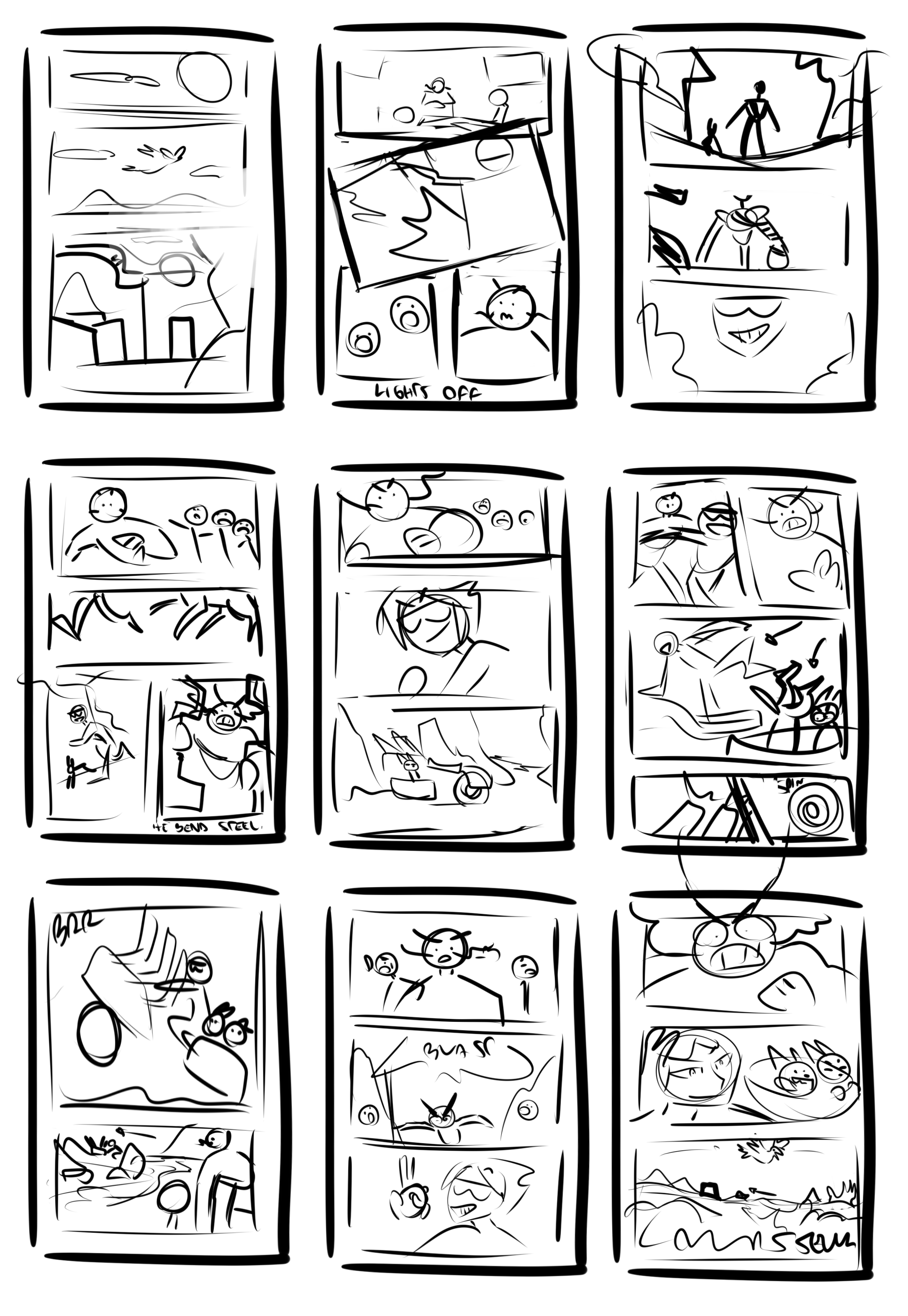 You also get to see how horrible our thumbnails are, but that's the magic of it: once more, plenty room to have fun with the actual layout of the panels when it's time to sketch it proper. It's surprising how much shitty doodles do the lifting when it comes to laying things out and having a plan, since you're not floating in space with no guidance, but also they're easily discardable if you come up with something better. If anyone out there is having trouble on the preproduction phase of a comic, I can vouch for shitty thumbnails any day of the week.
