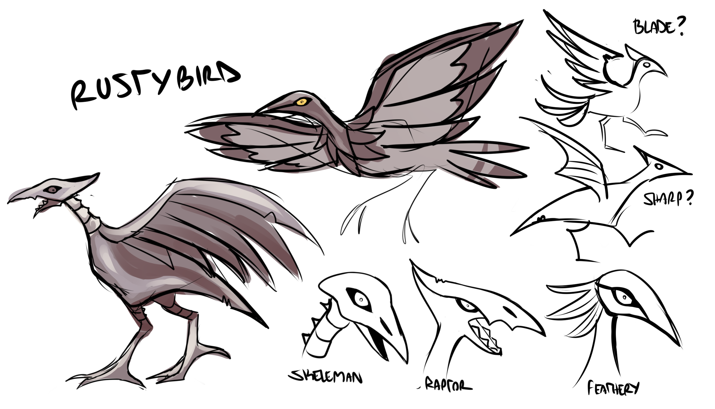 The dogs did go through a few iterations to kinda get the handle of what overall design mentality we wanted and it's likely I'll use them as a guiding light as we go on. When it came to the birdie, we borrowed from Stymphalian Birds and reworked it from there, and it seems to be the better approach; trying to use the actual 'mons as a starting point hasn't been very productive given their designs already work so well, it's hard to iterate on them without it feeling arbitrary.